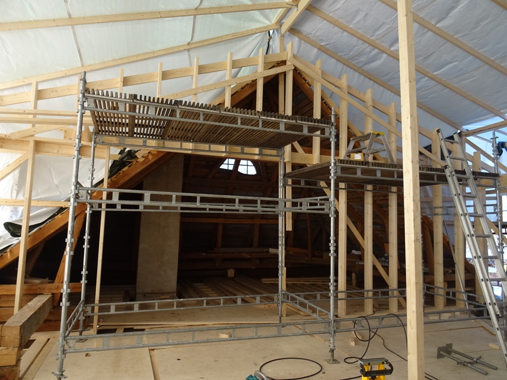 Yläkerran keskiosan vanhojen rakenteiden purku yläkerran keskiosan laajennuksen tieltä.